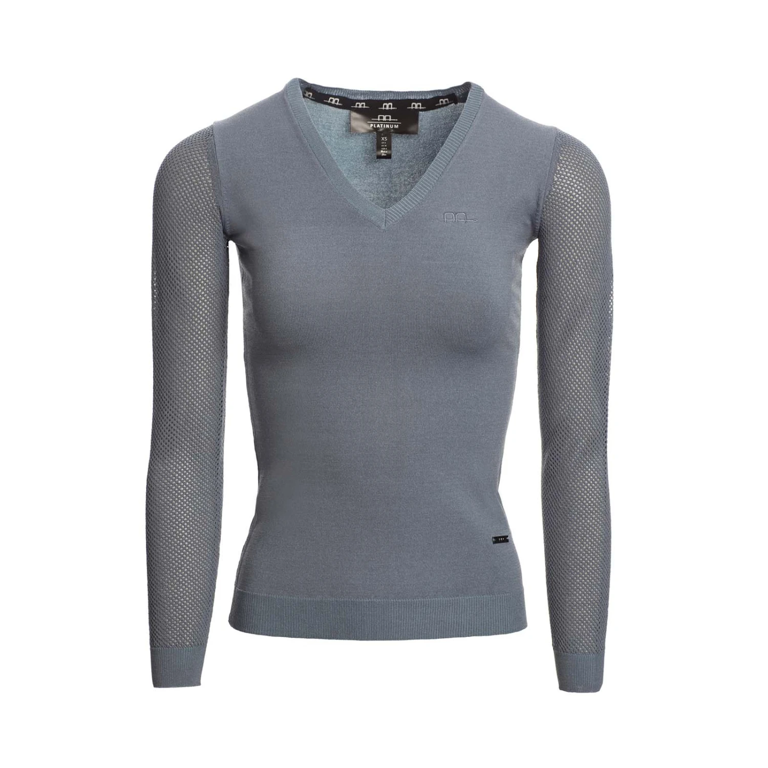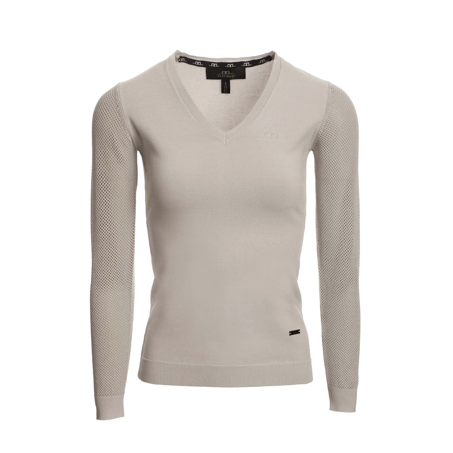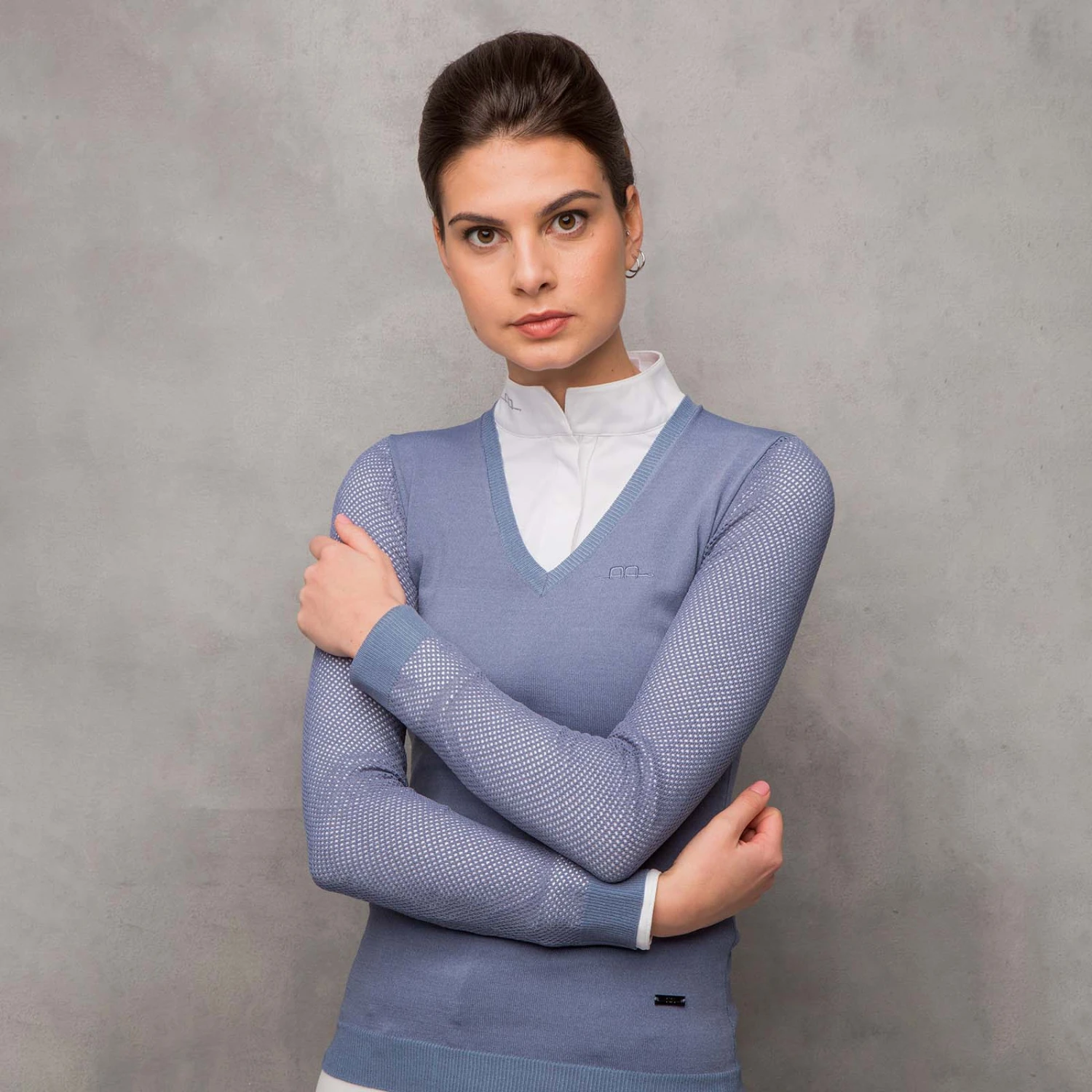 Ein italienischer, leichter Strickpullover mit V-Ausschnitt aus einer luxuriösen Mischung aus Rayon und Nylon. Dieser Strickpullover fühlt sich an und sieht aus wie ein elegantes Style-Statement mit atmungsaktiver, perforierter Stricktextur an den Ärmeln.
