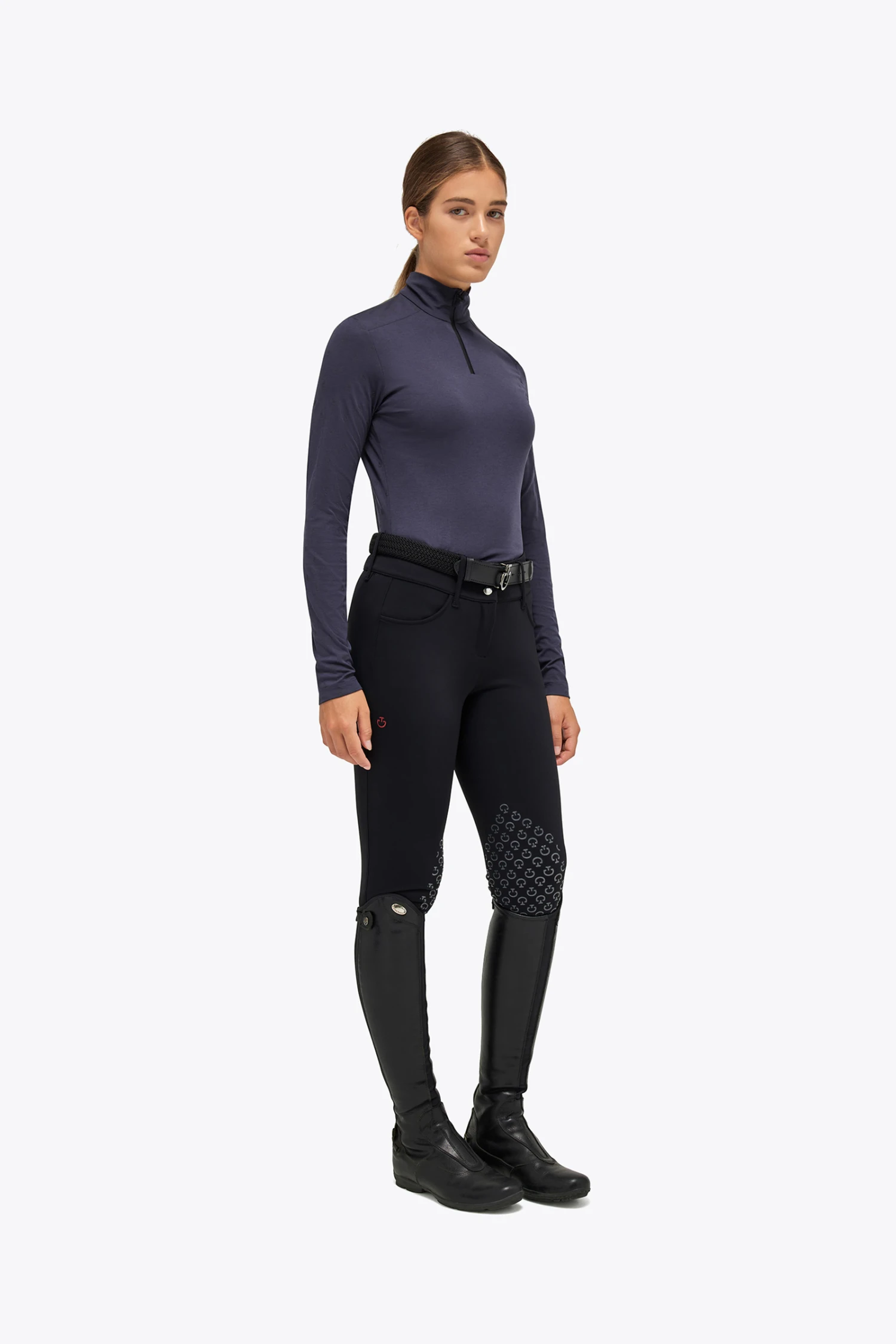 Dieses Trainingsshirt verkörpert das Erbe von Cavalleria Toscana, die perfekte Balance aus technischen Materialien und femininer Eleganz. Die schmale Passform betont die Taille, während der beflockte Allover-Logo-Print auf dem Rücken und den Ärmeln einen raffinierten grafischen Effekt erzeugt. Das leistungsfähige Wollgewebe schützt vor Kälte, während die extralangen Ärmel das Eindringen von Luft verhindern und der hohe Kragen mit einem viertel Reißverschluss das An- und Ausziehen erleichtert.