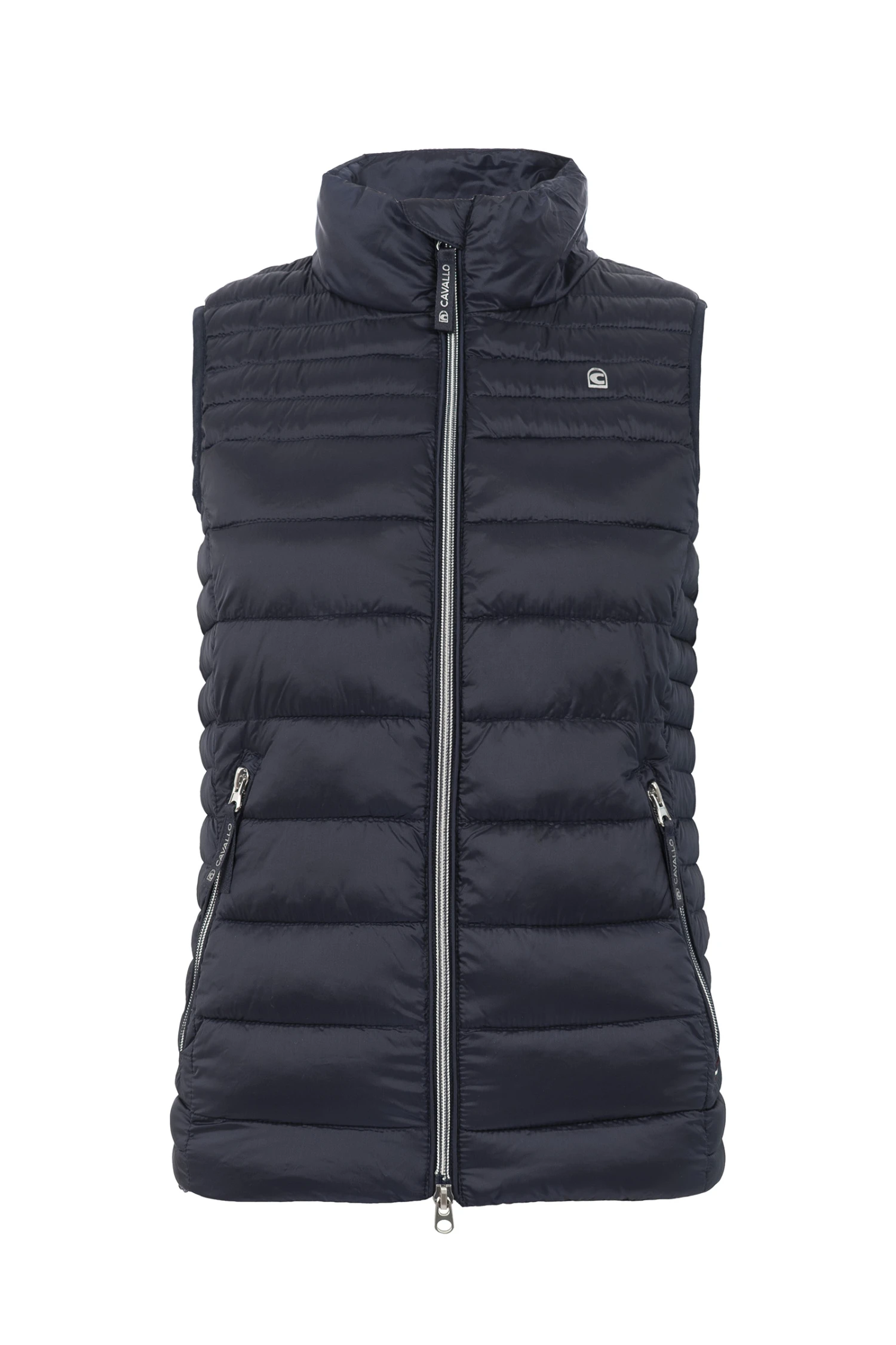Mit Stehkragen und leichter Taillierung. 2-Wege-Frontreißverschluss mit Cavallo Webbandanhänger. Zwei vordere Eingrifftaschen mit Reißverschlüssen. Innentasche mit Reißverschluss. Silberne Prints, z.B. Cavallo Logo auf linker Brust und Cavallo Artwork Hinten mittig am Kragen. Toniges Cavallo Artwork auf dem Reißverschlussuntertritt in der vorderen Mitte. Dunkelblaues Lining mit dezentem Allover Steigbügel Print. Dekorativer Cavallo Elastikbandeinsatz an der Taille im Rückenteil. Schmalere Steppung im Seitenteil und an den Schultern.
