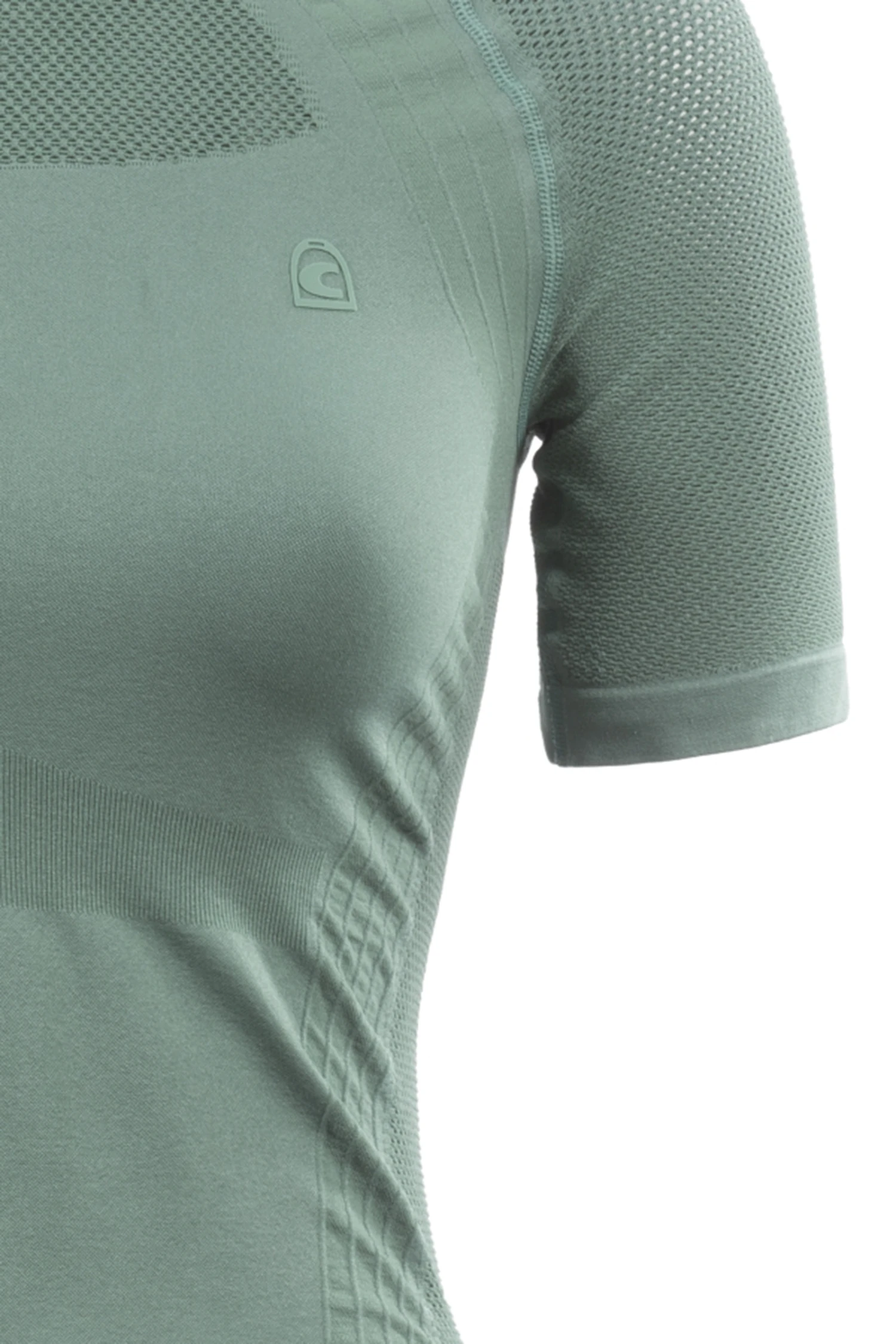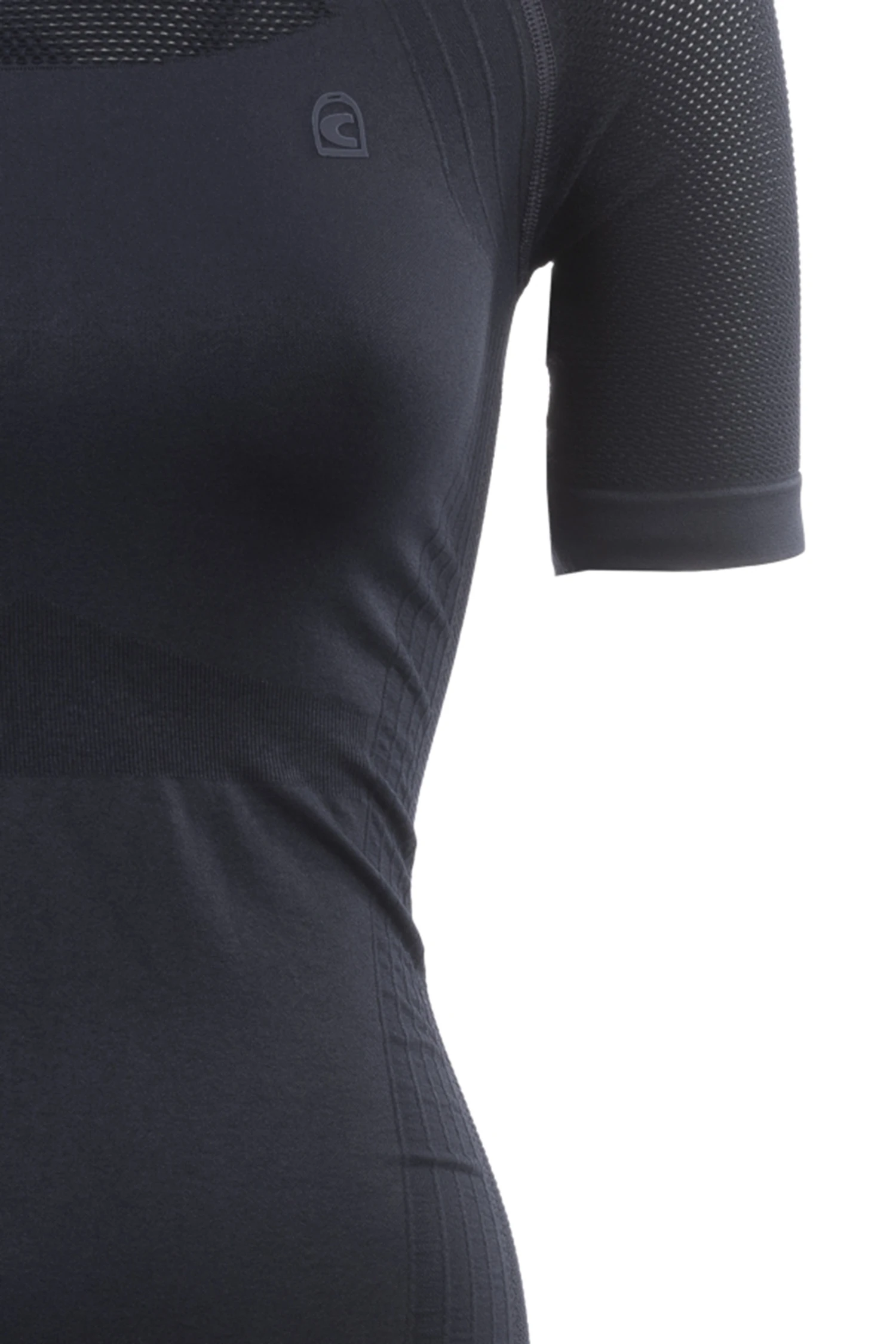 Mit Rundhals. Unterschiedliche Strukturen zeigen unterschiedliche Kompressionszonen. Der grobe Strukturbereich mit Mesh, der im Ärmel und kompletten Rückenteil eingesetzt ist, ist durchscheinend. Tonales erhabenes Cavallo Logo auf linker Brust. Extrem komfortabel durch nahtlose Verarbeitung und hohe Elastizität.