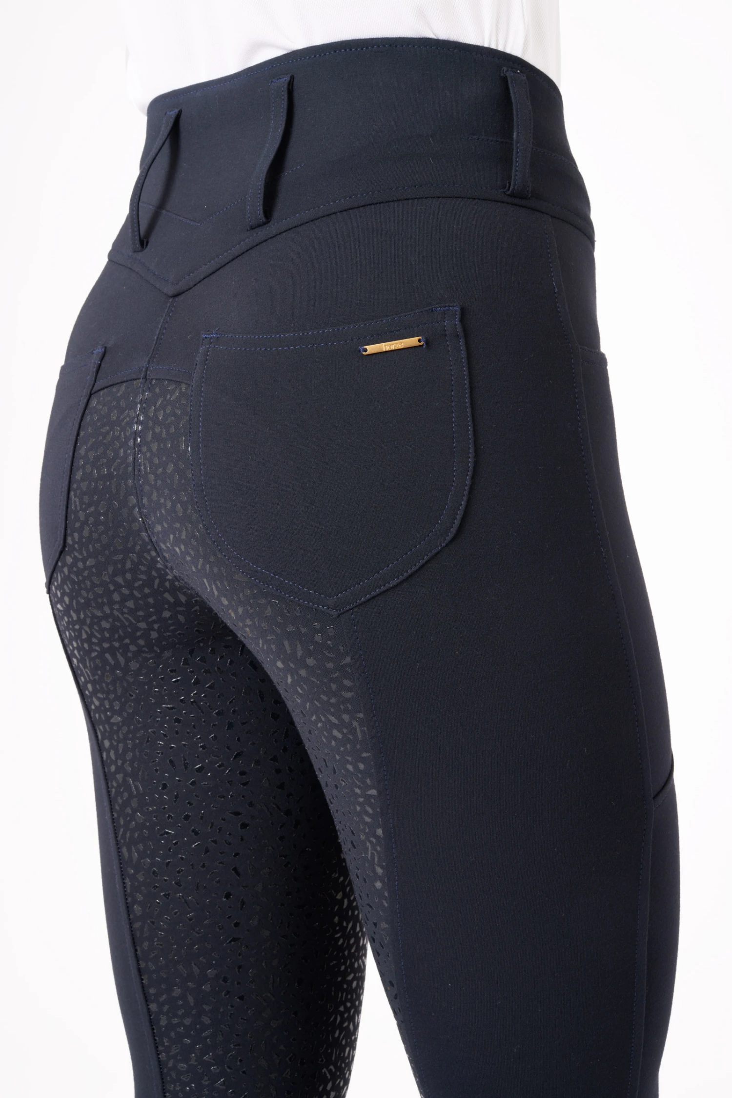 Die Horze Bella Reithose für Damen ist aus demselben Material wie unser Modell Tara gefertigt, das für seine außergewöhnliche Qualität und seinen Komfort bekannt ist. Die hohe Taille mit geformtem Rückenschnitt sorgt für eine schmeichelhafte Passform und zusätzlichen Halt, während die neue Silikonprägung mit kleinen „h“-Logos einen hervorragenden Halt im Sattel bietet. Auf der Vorderseite wird die Hose mit zwei Knöpfen geschlossen, um einen sicheren und bequemen Sitz zu gewährleisten.