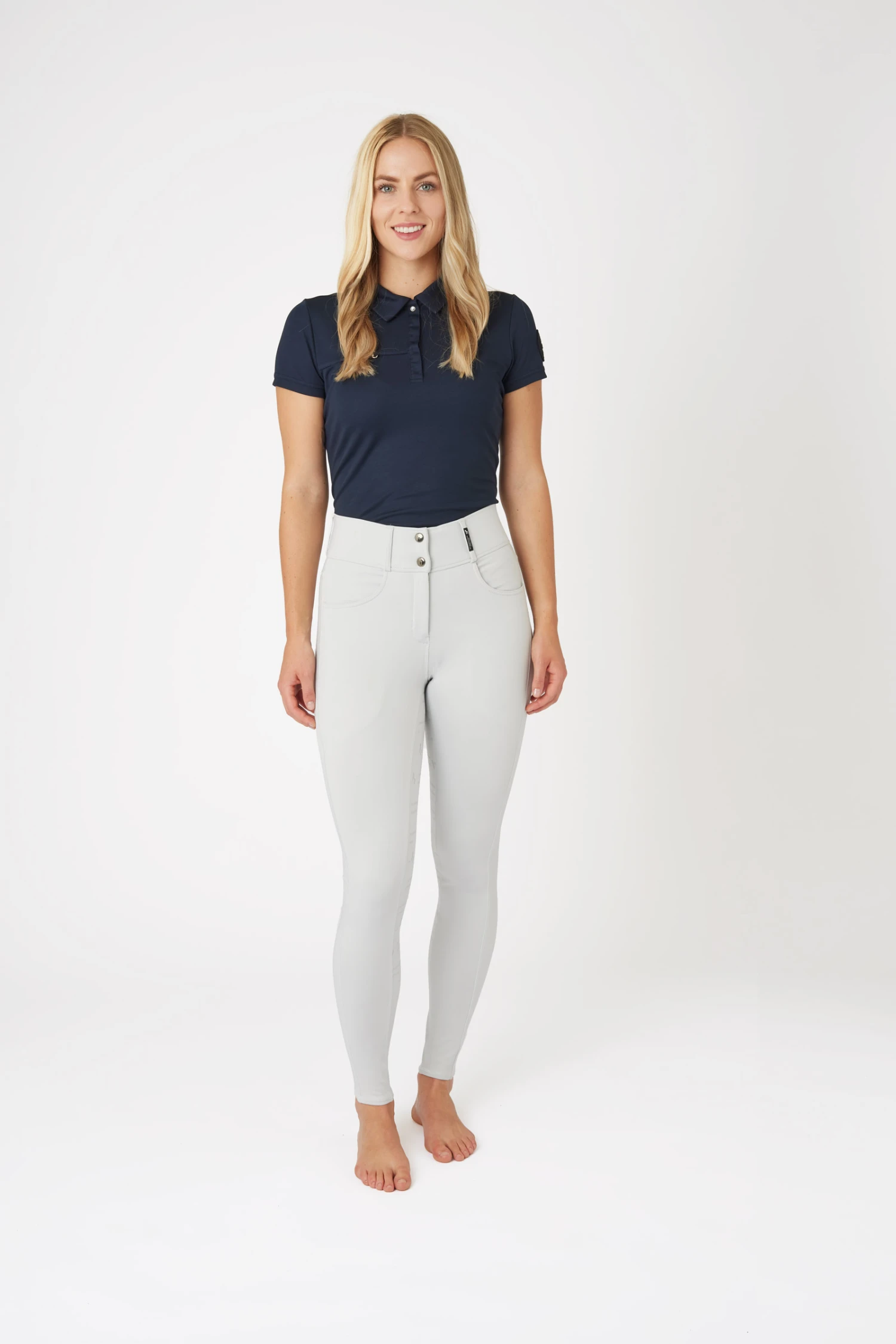 Diese Reithose aus Super-Stretch-Stoff bietet außergewöhnliche Flexibilität und Bewegungsfreiheit. Das hoch geschnittene Design sorgt für eine schmeichelhafte Passform und zusätzlichen Halt. Mit dem Silikongrip im Vollbesatz bietet diese Reithose eine hervorragende Traktion im Sattel. Der breite Bund mit V-Form und Gürtelschlaufe sorgt für einen bequemen und sicheren Sitz. Der vordere Verschluss verfügt über zwei Knöpfe für einen bequemen Sitz. Ein zartes Logo auf der vorderen Gürtelschlaufe verleiht einen Hauch von Eleganz.