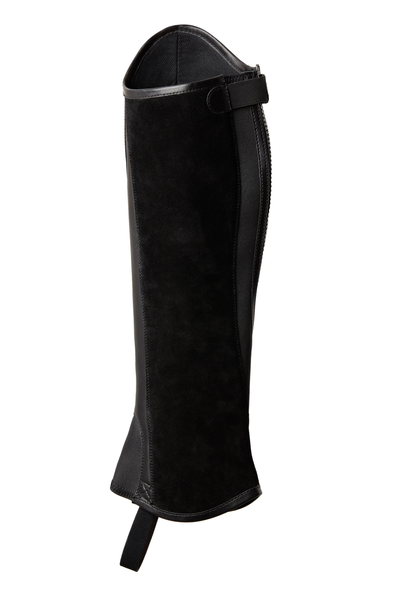 Elegante, alltagstaugliche Chaps mit zierlichen Lochdetails entlang der äußeren Wade. Für mehr Tragekomfort und eine bessere Passform ist entlang des robusten YKK-Reißverschlusses auf der Rückseite ein elastischer Einsatz eingesetzt. Die elastische Schürze auf der Vorderseite sorgt für einen passgenauen Sitz über den Reitstiefeletten. Der Reißverschluss wird mit Logo-Druckknöpfen oben und unten gesichert. Die Innenseite der Wade ist mit rutschfestem Wildleder ausgestattet, damit dein Unterschenkel sicher liegt. Passt perfekt zu den Wicklow Rietstiefeletten #38269.
