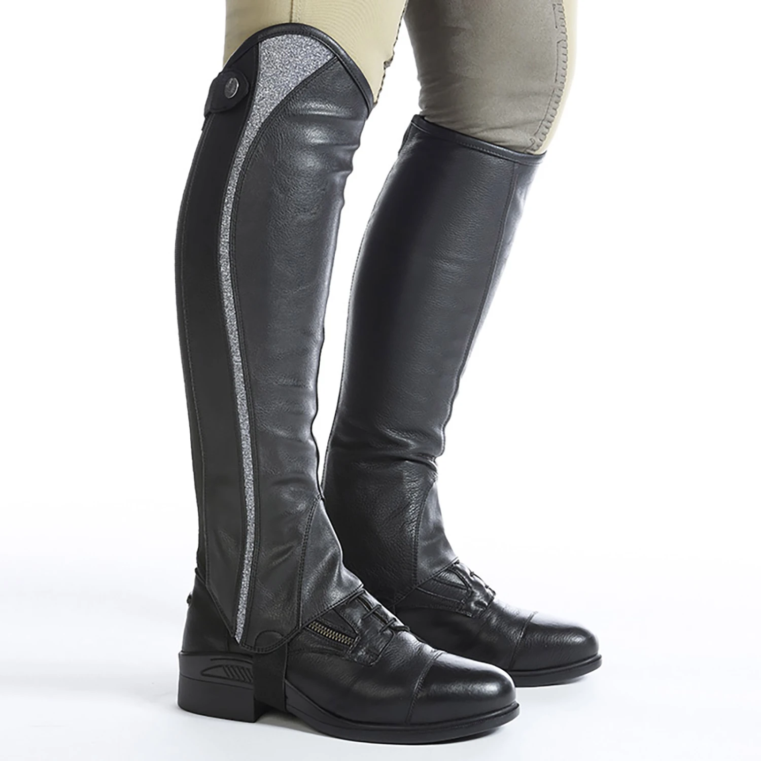 Die Combi Chaps Fashion haben ein Glitzerband direkt an der Seite, welches das Reiterbein schlank wirken lässt und durch verschiedene Lichteindrücke leicht funkelt. Für den dezenten, aber eleganten Ritt!