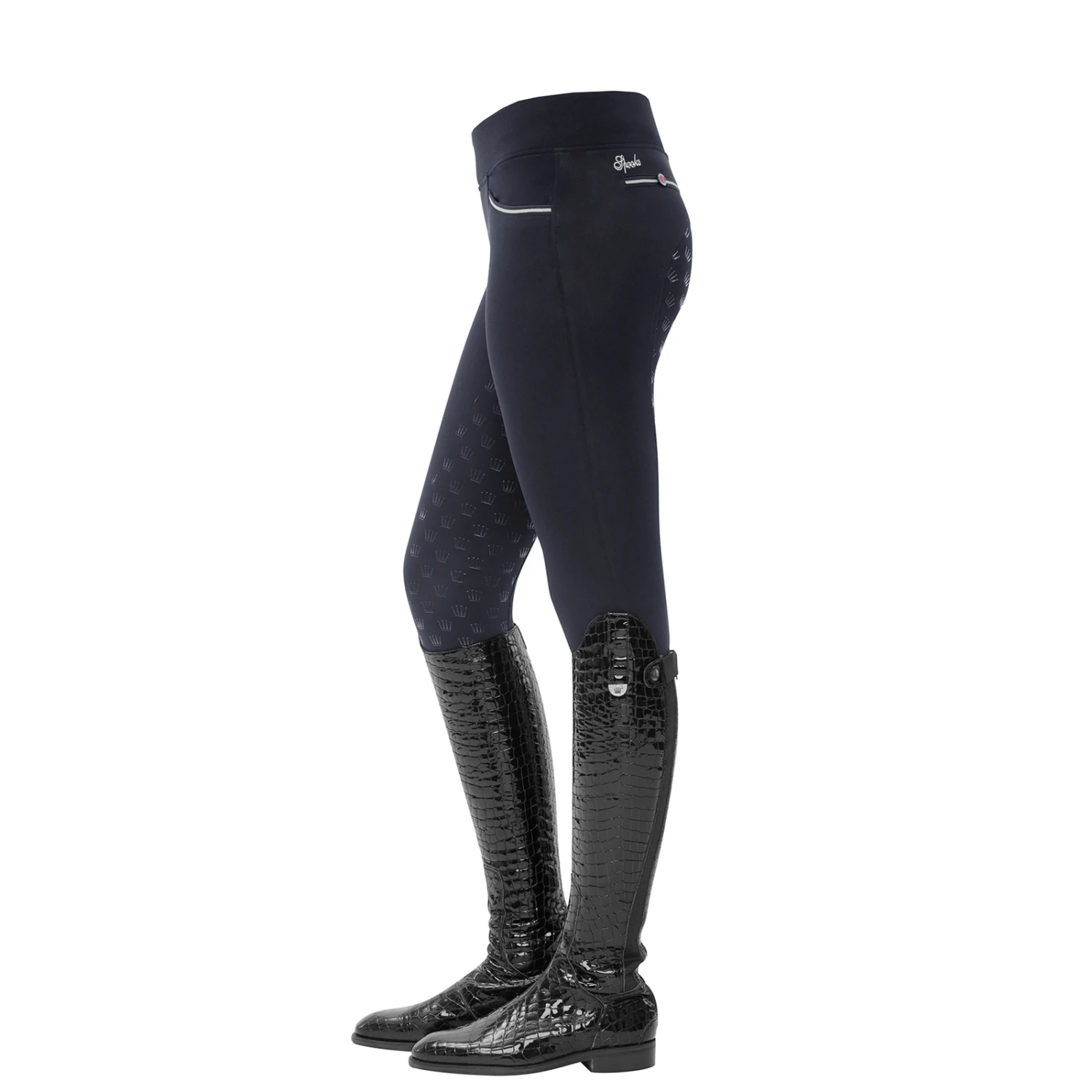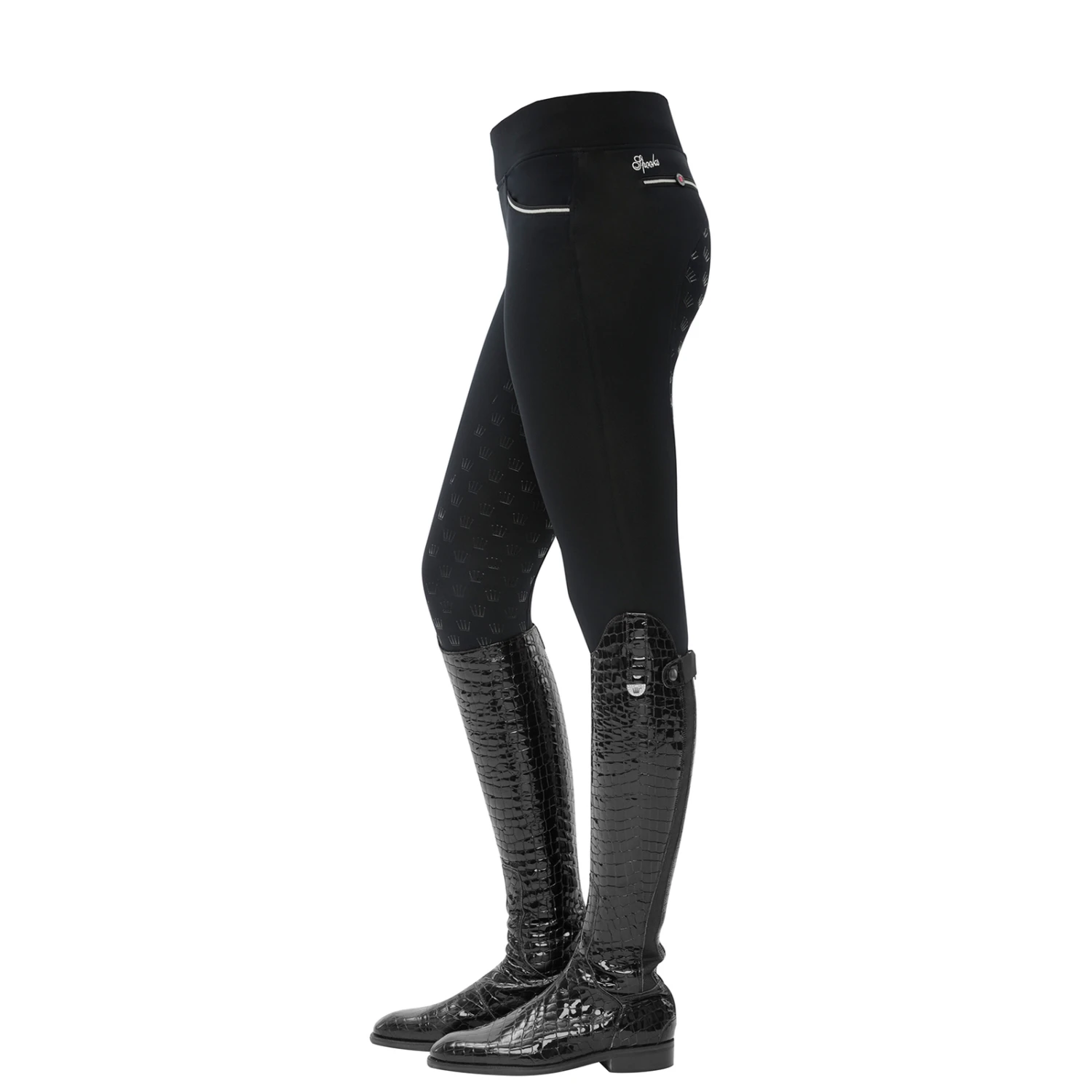 Super light riding leggins with crown-grip and an extra high waistband for a perfect fit. On the right side there is a practical mobile phone pocket. In addition, the breeches have a usable front pocket and two decorative back pockets.