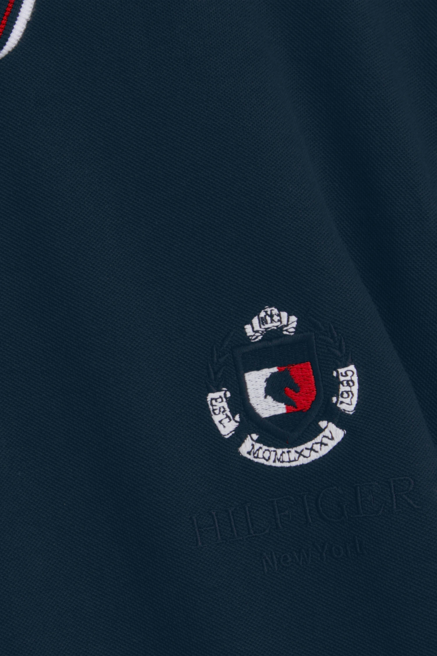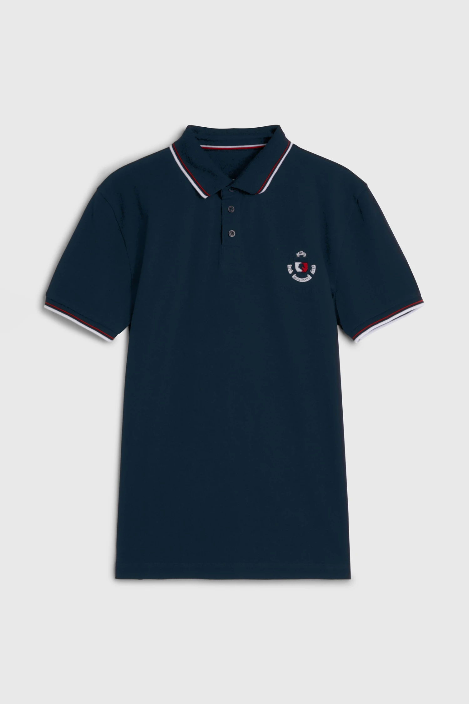 College Stil kurzarm Polo Shirt mit kurzer Knopfleiste vorne, Rippstick-Bündchen und -Saum, aufgesticktes Logo auf der linken Brust und am linken Ärmel